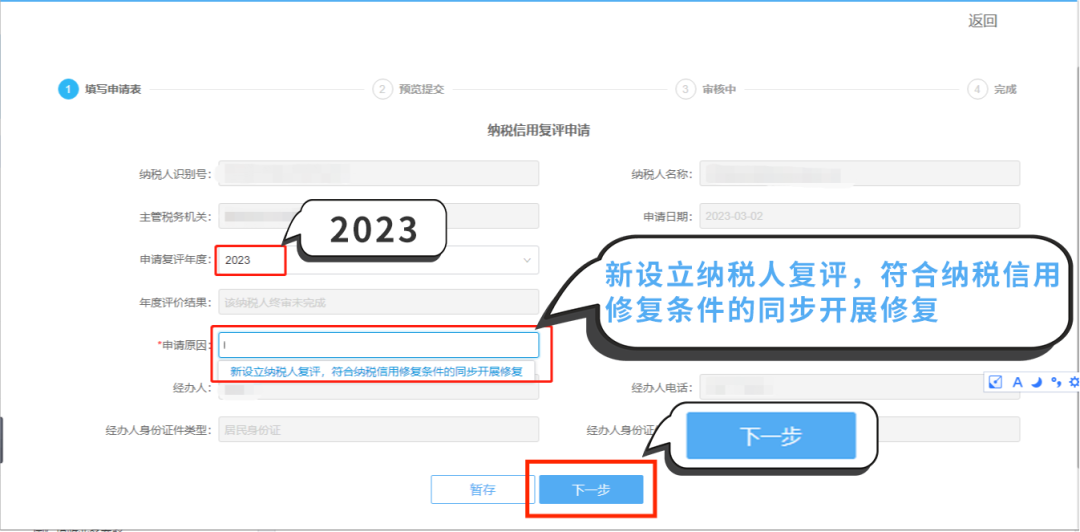第二步:填寫申請信息。系統(tǒng)會自動帶出納稅人名稱、納稅人識別號等基本信息,您可以在“申請?jiān)?rdquo;欄選擇【新設(shè)立納稅人復(fù)評,符合納稅信用修復(fù)條件的同步開展修復(fù)】,然后點(diǎn)擊【下一步】。