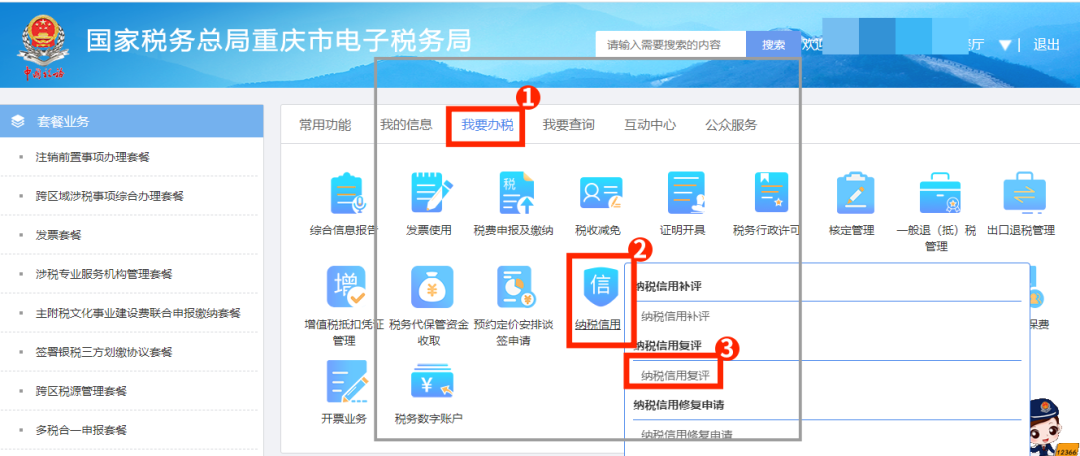 第一步:打開重慶市電子稅務(wù)局網(wǎng)頁端,選擇“企業(yè)業(yè)務(wù)”登錄,依次點(diǎn)擊【我要辦稅】—【納稅信用】—【納稅信用復(fù)評】,進(jìn)入申請頁面。