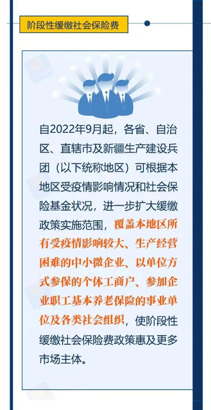 近日,人力資源社會(huì)保障部辦公廳、國家發(fā)展改革委辦公廳、財(cái)政部辦公廳、國家稅務(wù)總局辦公廳印發(fā)《關(guān)于進(jìn)一步做好階段性緩繳社會(huì)保險(xiǎn)費(fèi)政策實(shí)施工作有關(guān)問題的通知》。利好政策,一圖看懂——