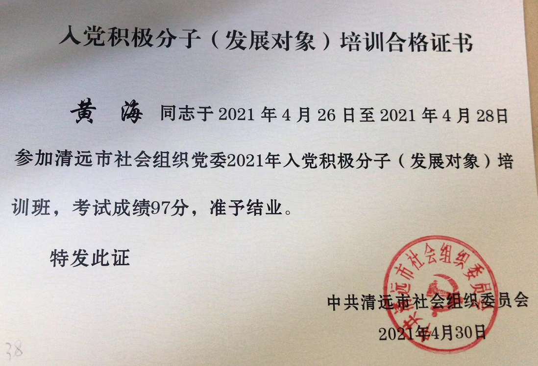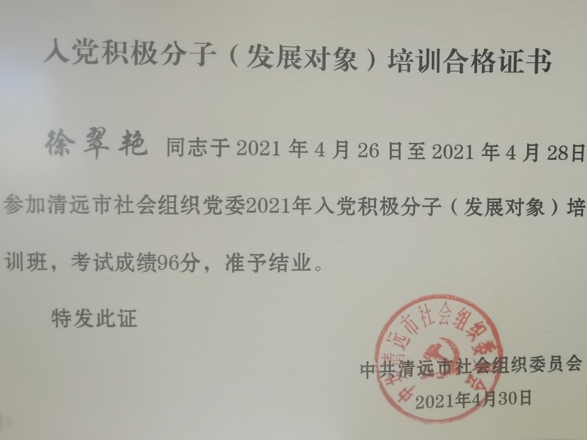 我協(xié)會黨支部成立以來,高度重視開展黨建工作,積極發(fā)展和培養(yǎng)黨員,2021年確定2名發(fā)展對象,并于4月26日至28日參加了中共清遠市社會組織委員會2021年入黨積極分子(發(fā)展對象)培訓班。